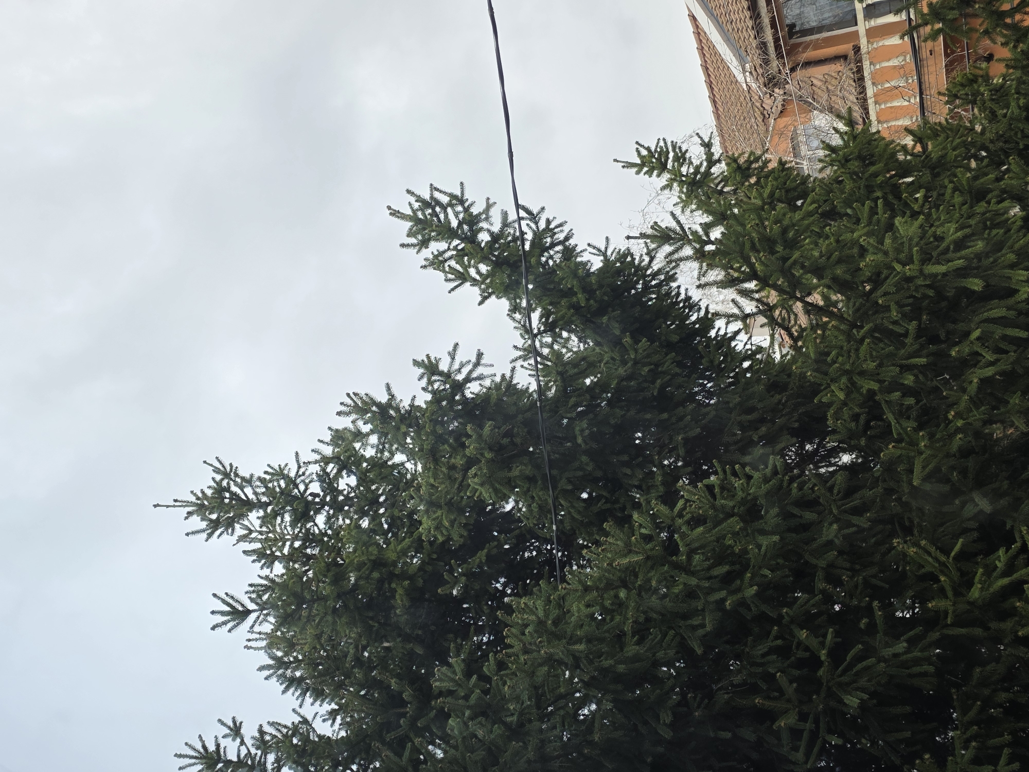 The image presents a view looking upwards, encompassing a cloudy sky, a portion of a building, and the foliage of a coniferous tree