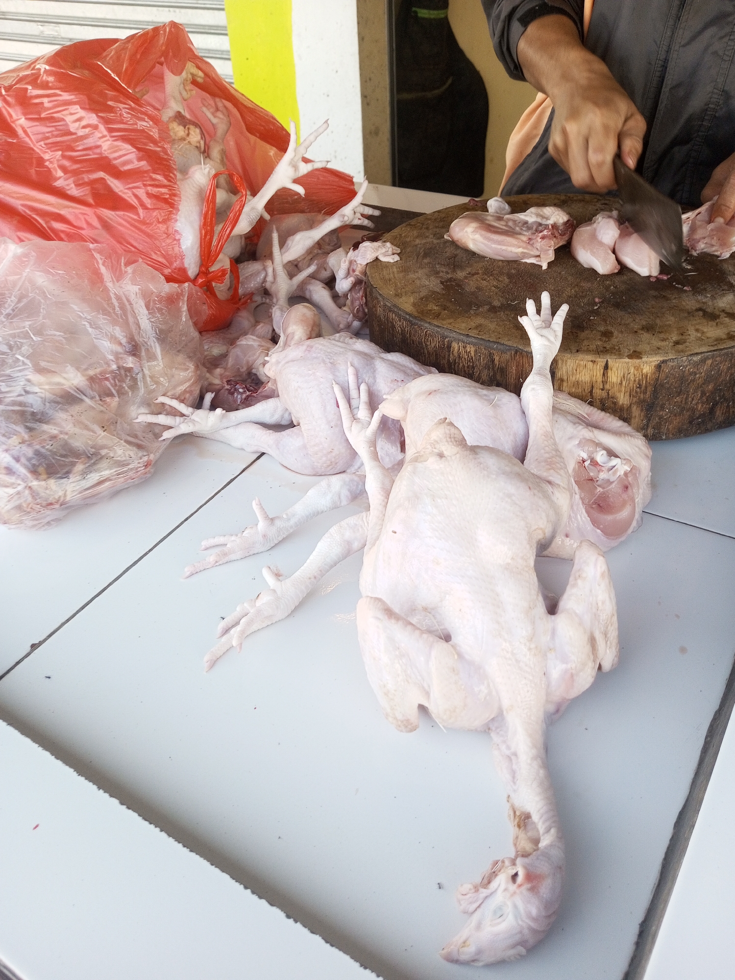 In Nhot Chang, Laos, a butcher cuts up raw chickens on a wooden board. Several whole, defeathered chickens are arranged on a white tiled surface, and a clear plastic bag and a red plastic bag contain chicken parts. The butcher, wearing a grey long-sleeved shirt, uses a large cleaver to cut the meat. The scene is a market setting with yellowish walls in the background.