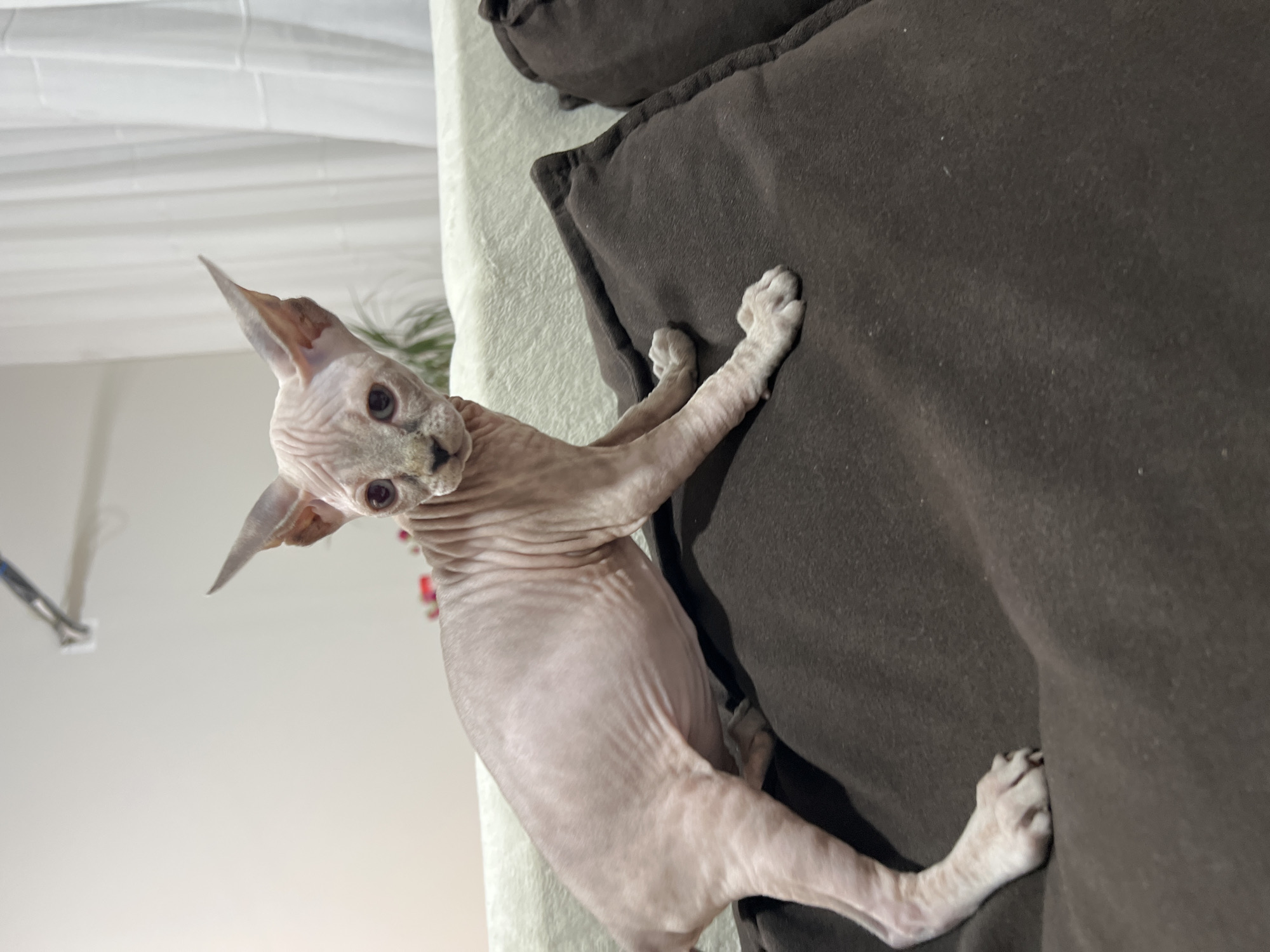 A hairless Sphynx cat clings to a brown cushion on a light-colored surface