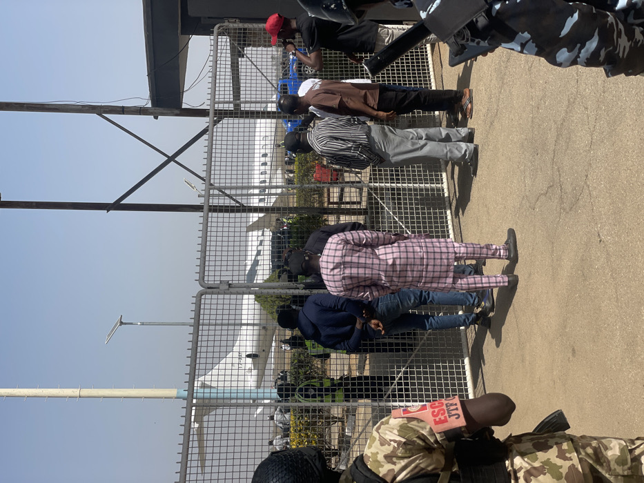 The image depicts an outdoor scene at an airport in Kwi, Nigeria, under clear daylight conditions