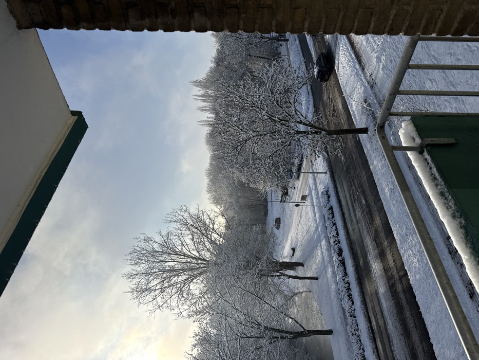 The image displays an elevated view of a snow-covered urban environment in Amstelveen, Netherlands. In the immediate foreground, a metal balcony railing with a light dusting of snow is visible, affixed to a green-painted balustrade. A section of a light brown brick wall appears on the right edge, and a white ceiling overhang with a green trim is present at the top. The landscape beyond is blanketed in fresh snow under a clear blue sky, with sunlight originating from the upper left quadrant. A two-lane asphalt road, largely clear of snow with dark, wet areas, runs across the midground. Snow-covered shoulders and a low, snow-laden hedge border the road. To the left of the road, a body of water, consistent with a canal or small river, reflects the sky. Several deciduous trees, their bare branches heavily coated with snow, line the waterway and the adjoining snow-covered parkland. A light-colored sedan is parked in the snow within this park area. On the right side of the road, a dark-colored SUV is positioned, with visible tire tracks in the adjacent snow. Streetlights and traffic signs are identifiable along the road. The background consists of a dense treeline, also covered in snow, illuminated by diffuse sunlight. No individuals or direct interactions are depicted within the scene.
