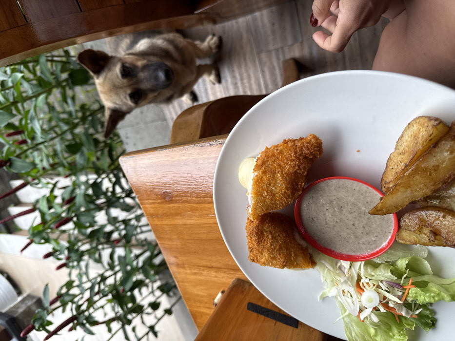 The image displays a meal set on a light-colored wooden table in an outdoor or semi-outdoor setting in Unknown, Indonesia. A white circular plate occupies the foreground, holding two breaded, deep-fried items, a small red-rimmed bowl with a speckled grey dip, a side salad of green lettuce with shredded white and orange vegetables, and multiple golden-brown potato wedges. A small quantity of white condiment is visible near the fried items. A human hand, manicured with dark red nail polish, is partially visible at the lower right, alongside a bare thigh. In the midground, a small dog with light brown fur and darker brown markings on its face and back stands on a grey patterned surface, gazing intently at the food on the plate. The background features green plants with numerous tall, red, spiky inflorescences, positioned against a light-colored building facade.