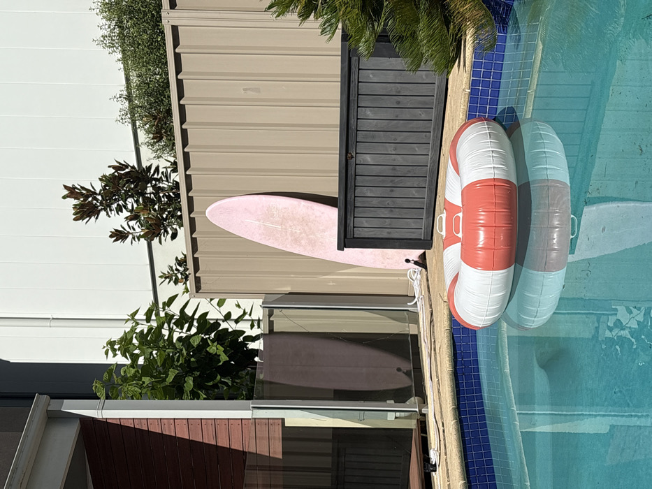 A pink surfboard rests against a beige metal wall next to a black wooden cabinet. Two inflatable rings, one red and white and the other clear, float in a swimming pool bordered by blue tiles. Nearby, green foliage grows, and a reflection of the surfboard is visible in a window. The overall scene suggests a backyard setting.