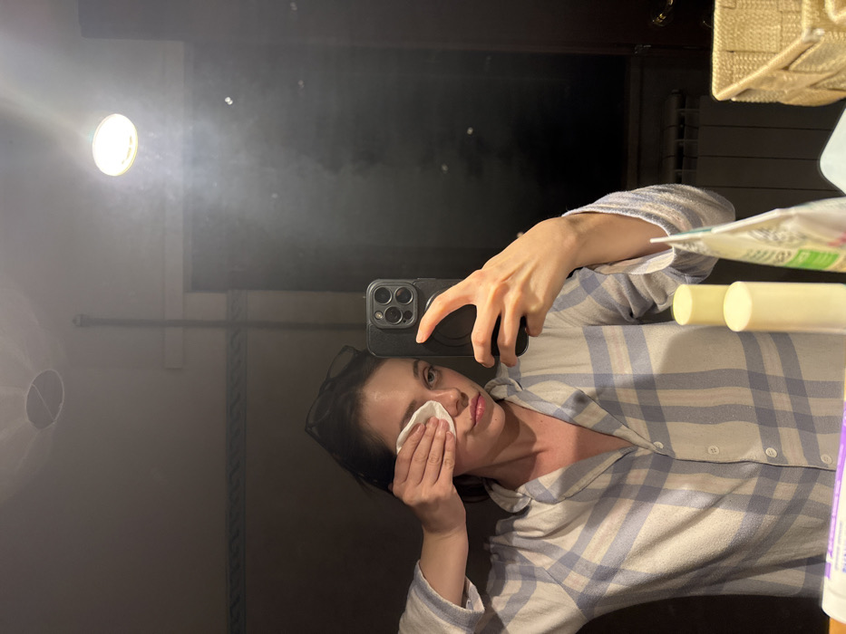 A young adult female is depicted in a mirror selfie taken within an interior space in the city of Fiuggi, Italy. She wears light blue and white plaid pajamas and has dark-framed glasses resting on her head. Her left hand holds a white circular cotton pad against her left eye, suggesting a cleansing or makeup removal action. Her right hand operates a black smartphone, equipped with a multi-lens camera system and a black pop socket, to capture the image. The reflection in the mirror reveals a light-colored wall with a horizontal decorative border, a vertical pipe, and an illuminated circular ceiling light fixture positioned in the upper right. A circular ceiling vent is visible in the upper left reflection. On the counter in the foreground, two light-colored cylindrical cosmetic tubes, a patterned sachet, and a light-colored woven storage basket are present. A white radiator and a dark door with a metallic doorknob are partially visible in the reflected background to the lower right. The mirror surface displays minor smudges.