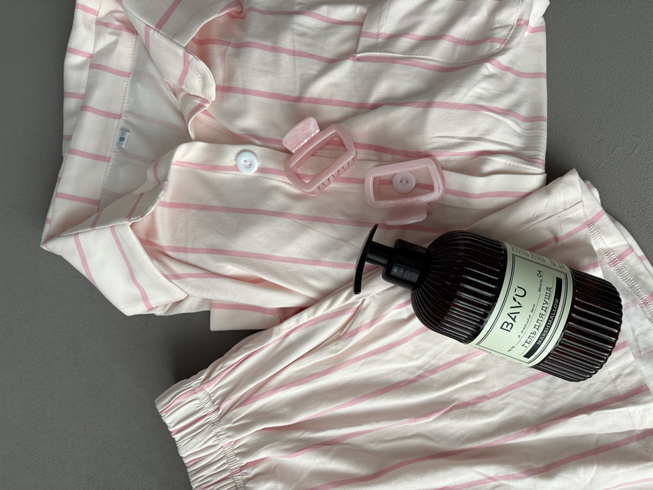 The image displays an overhead shot of several items laid out on a plain, dark gray surface. The specific location within Chaikovsky, Russia, or any other city, is not discernible from the image content. The central subject is a two-piece pajama set, consisting of a long-sleeved shirt and shorts. Both pieces are light beige or off-white with thin vertical pink stripes. The shirt features a collar, a button-down front with one visible white button, and a left chest pocket. An "S" size tag is visible on the inside collar of the shirt. The shorts have an elastic waistband and pockets. To the left of the shirt and overlapping the shorts is a dark brown, vertically ribbed pump bottle. Its label, primarily light green, displays "BAVU" at the top, followed by "ГЕЛЬ ДЛЯ ДУША" (Shower Gel) in Cyrillic, and "MARSHMALLOW" in English below it. "Brand No. 04" is also visible on the label. To the right of the shirt's collar and partially resting on its front, are two small, translucent light pink rectangular hair claw clips.