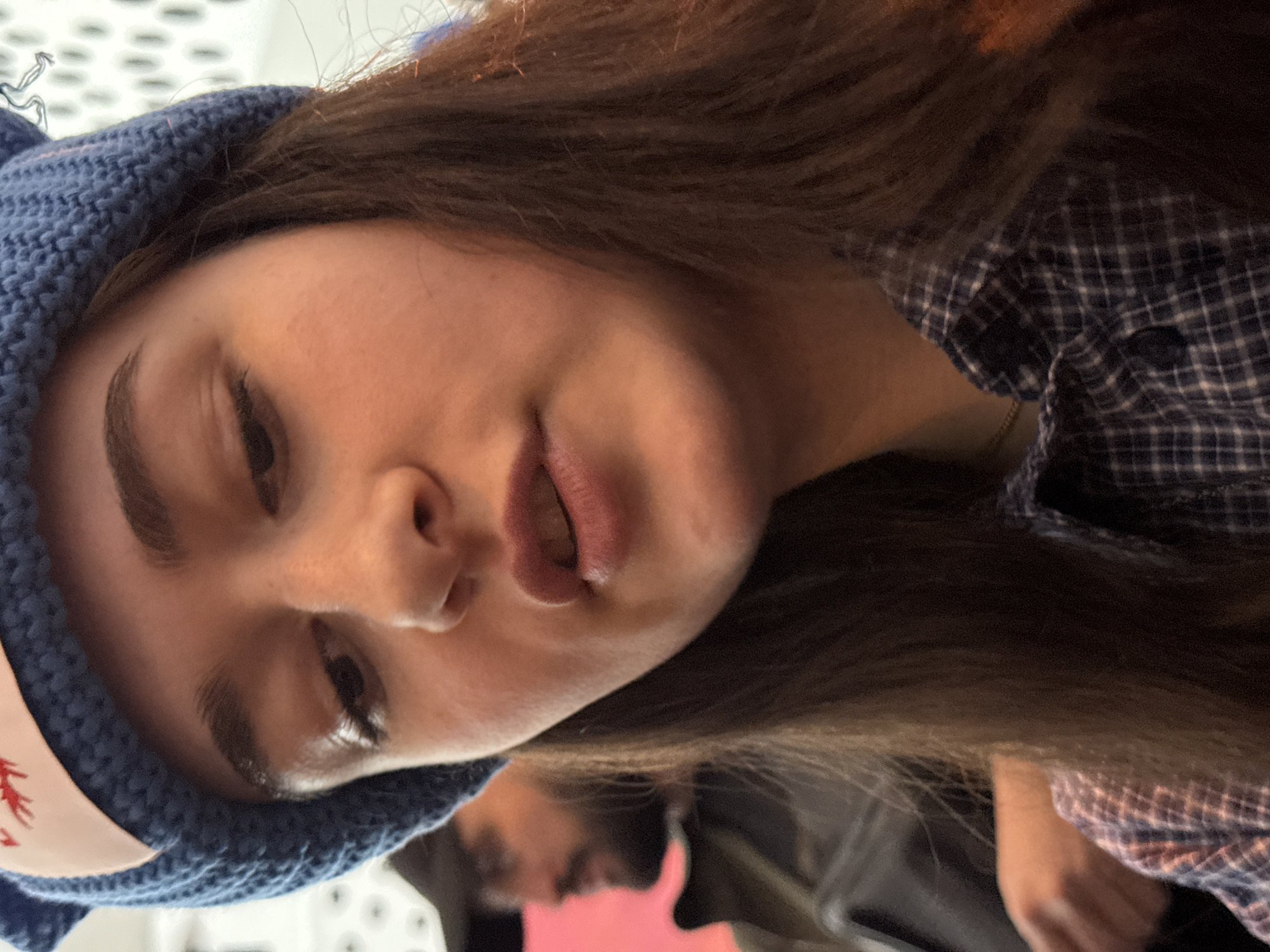 A young woman is seen from an elevated angle, wearing a blue knit beanie with a red and white tag on her head. She has brown hair and is wearing a plaid shirt. In the background, a man with a beard is partially visible, along with a blurred surface and what appears to be a pink object. The background also features a white surface with black dots or patterns. The location appears to be indoors.