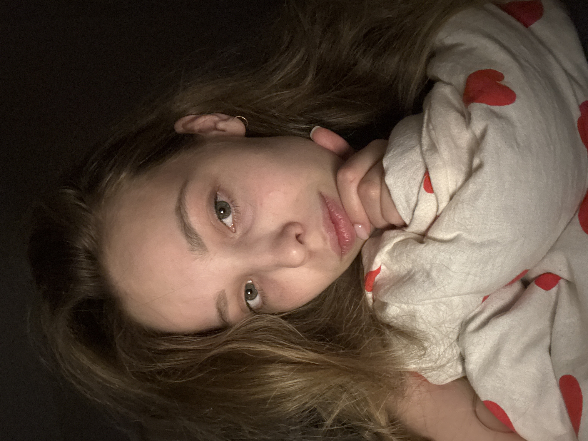 A young fair-skinned person with wavy, brown hair is wrapped in a white blanket with red heart-shaped prints. The person is looking towards the camera with gray/green eyes, with their left hand supporting their head near the cheek. A small gold hoop earring is visible on the left ear. The background is dark and out of focus. This photo does not contain any information about the location in Chaikovsky, Russia.