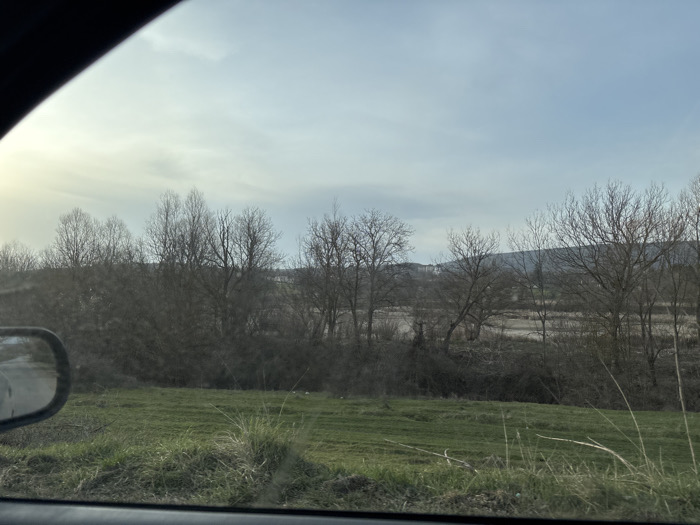 The image depicts an exterior landscape viewed from inside a vehicle, evidenced by the dark frame in the upper left and a partial side mirror visible in the lower left. The scene is located in Suhache, Bulgaria, under an overcast sky with diffuse light. In the immediate foreground, a strip of green grass and dry vegetation is present. The midground features a dense line of bare deciduous trees, indicating a late autumn, winter, or early spring season. Beyond these trees, a lighter-toned, possibly fallow field or shallow body of water is visible. In the background, low-lying hills or mountains are discernible. A cluster of light-colored buildings, possibly part of a distant settlement, can be seen behind the trees on the left side of the frame. No individuals, animals, or specific activities are observed.