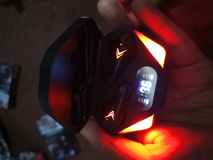 A hand holds open a black, angular earbud charging case. Inside, two black earbuds rest. The case features a blue LED display showing 98% battery and orange, arrow-shaped indicators on the earbuds. Red light emanates from the case's edges and illuminates the hand, indicating charging or a powered-on state. Other boxes with labels on are visible in the background.