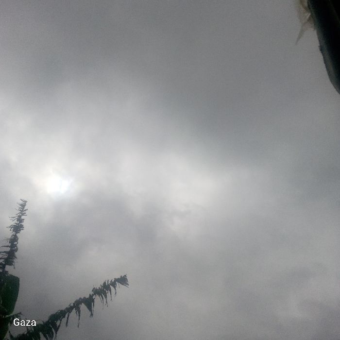 The image depicts an overcast sky over Kamera ward, Kenya, dominated by dense, grey cloud cover. A bright, diffused light source, indicative of an obscured sun, is visible in the upper-left quadrant. Two dark green, leafy branches are prominent: one extends vertically along the left edge of the frame, and another shorter branch angles upwards from the bottom-left. Both sets of leaves appear somewhat dishevelled, potentially from wind or rain. A dark, indistinct object is partially visible in the top-right corner, intruding slightly into the frame. White text "Gaza" is superimposed on the image in the bottom-left corner. No human figures or discernible actions are present.