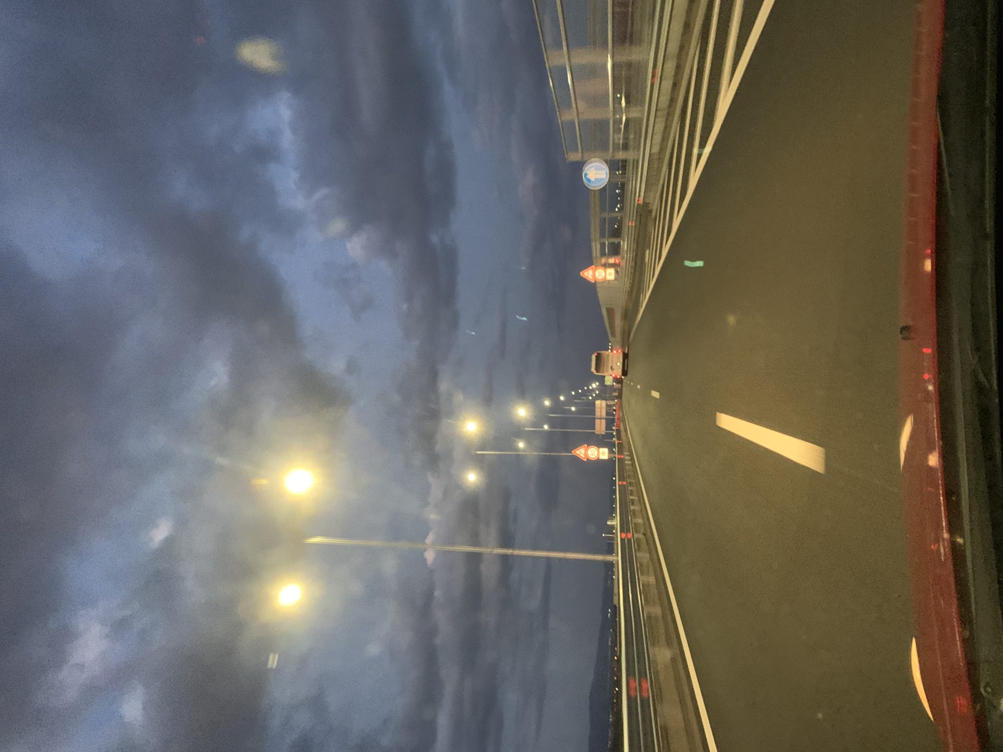 view from a car driving on a bridge at night