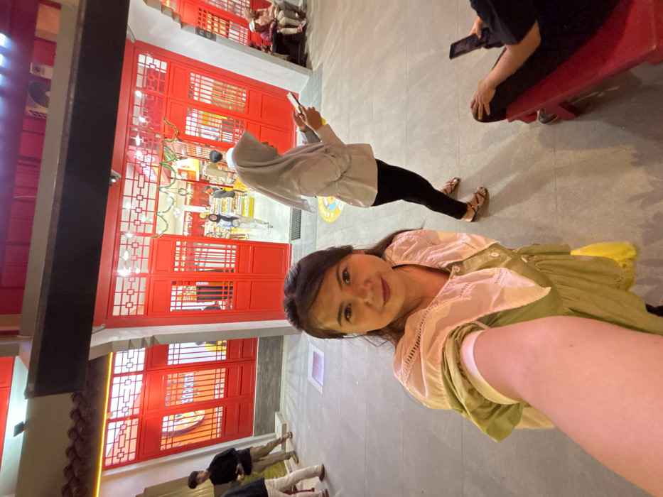 The image displays an illuminated outdoor pedestrian area at night within Sentra Wisata Kuliner Shakata, Surabaya, Indonesia. In the immediate foreground, a woman with dark hair, wearing a light-colored, ruffled blouse, extends her right arm to take a selfie, smiling directly at the camera. To her right, a woman in a light grey hijab, light grey top, and black pants stands, observed looking down at a smartphone held in both hands. A third individual is partially visible in the lower right, seated on a red bench and interacting with a smartphone. The background is defined by a row of brightly lit storefronts featuring prominent red facades, elaborate latticework on windows and doors, and architectural elements reminiscent of traditional Chinese design. The central storefront's interior is visible, displaying merchandise and further illuminated by internal lighting. The name "Shakata" is discernible on the left side of this central establishment. Green and red decorative garlands are strung above the main entrance, contributing to a festive atmosphere. Scattered red benches are positioned along the light grey paved surface of the pedestrian zone. On the far left, two men walk away from the camera. The entire scene is well-lit by a combination of storefront illumination and overhead ambient lighting.