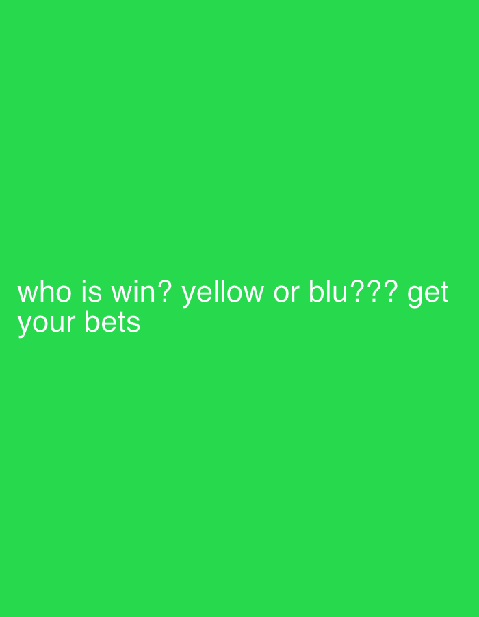 The image displays a solid, uniform green background. White sans-serif text is centered horizontally in the lower portion of the image, appearing on two lines. The first line reads: "who is win? yellow or blu??? get". The second line, directly below and slightly offset to the left, reads: "your bets". No people, discernible subjects, objects, actions, or specific environmental details are present. There is no visual information within the image to determine a specific location in Minsk, Belarus, or any other geographical area.