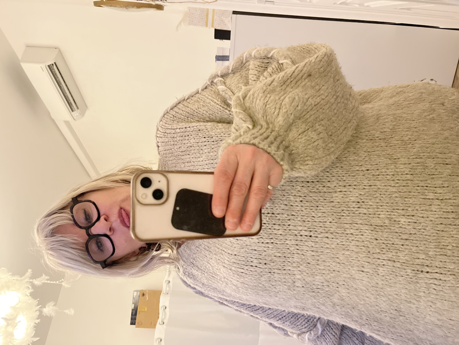 A woman with platinum blonde hair and black glasses holds a phone up, taking a mirror selfie. She wears a chunky knit sweater in a light tan or beige color. The sweater has a large, textured sleeve. The room in the background appears to be a bedroom, with a white air conditioning unit on the wall. Other objects like a packaged box and some wall decor are visible. The image appears rotated or flipped.