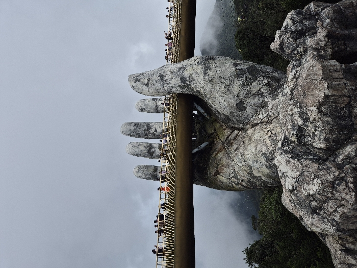 An upward-angled, off-kilter shot features the Golden Bridge in Vietnam, held by colossal stone hands