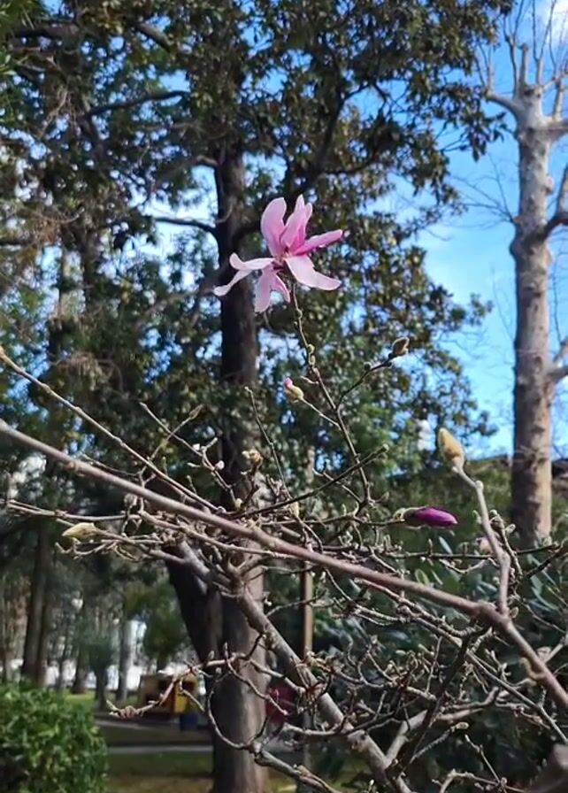 single pink magnolia flower on a branch, with several unopened buds nearby. The branch is bare, with other trees visible in the background. The sky is visible through the branches. The camera zooms in slightly on the flower. The setting appears to be a park or garden.