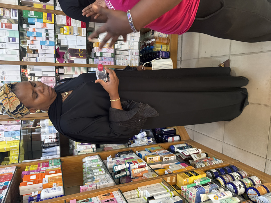 In an indoor retail store in Galadimawa, Nigeria, an adult female of African descent stands, clad in a black abaya featuring pleated cuffs, a multi-colored patterned headwrap, gold stud earrings, and a gold pendant necklace. She wears a thin gold-colored bracelet on her left wrist and holds a small, clear plastic bottle with a pink cap in her left hand, directing her gaze downward at the object. A white woven handbag hangs at her right hip. To her right, a second individual, partially visible, wears a bright pink top and dark bottoms, with a silver-colored bracelet on their right wrist. This person's right hand is raised and open, gesturing towards the primary subject. The background comprises multiple tall, wooden display shelves filled with an assortment of packaged skincare, cosmetic, and personal care products. The floor is light-colored tiled.