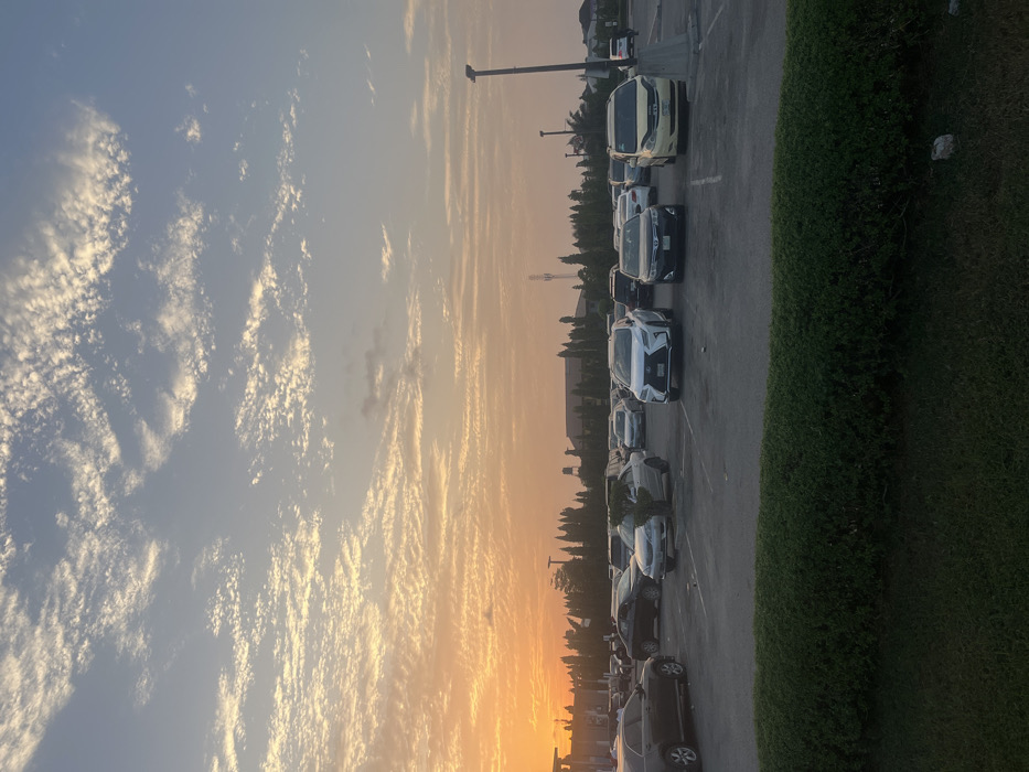 A parking lot with rows of vehicles is situated next to a thick green hedge. The sky transitions from a blue scattered with small clouds to an orange glow near the horizon, likely indicative of sunrise or sunset. A light pole stands tall among the scene. Buildings are visible in the distance.