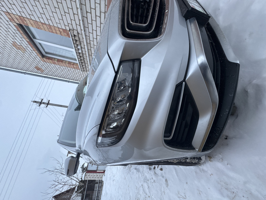 A close-up, canted shot shows the front of a silver car parked in the snow. The car's grill, headlight, and bumper are prominent. Behind the car is a snow-covered landscape with a brick building and some trees. The sky is overcast. Power lines are visible in the distance. The car appears to be clean.