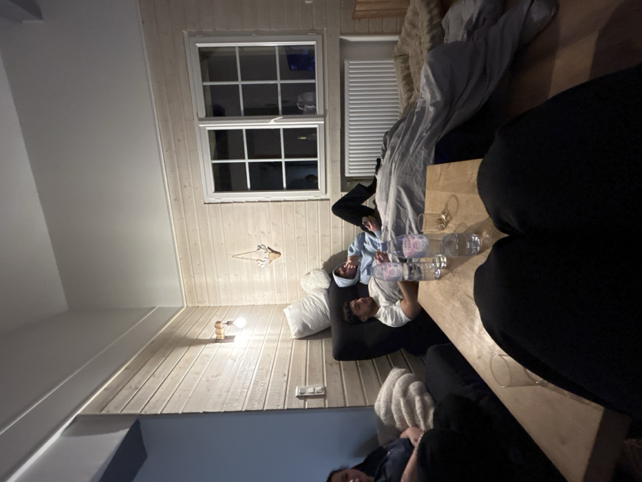 A slightly askew indoor scene features several individuals relaxing. Two people recline on cushions near a window with a decorative fish hanging nearby. A table displays empty bottles and glasses. A radiator is situated above the window. The room is wood-paneled, and another person is partially visible in the foreground wearing black clothing. The image appears to be taken from a casual, candid perspective.