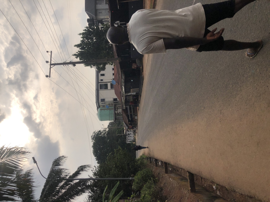A man in a white shirt and dark shorts walks on a paved road, his back to the camera. Buildings and trees line one side of the road, with power lines overhead. The sky is overcast, suggesting an early morning or late afternoon light. Palm trees are visible in the lower left corner.
