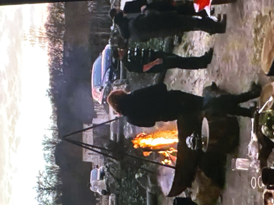 A blurry outdoor scene shows a fire pit with flames, suspended by a tripod. People stand around the fire, some in dark clothing. Vehicles are visible in the background, including a blue van and a white car. The overall setting appears to be a casual gathering or event in a natural environment. The image has a slightly overexposed quality.