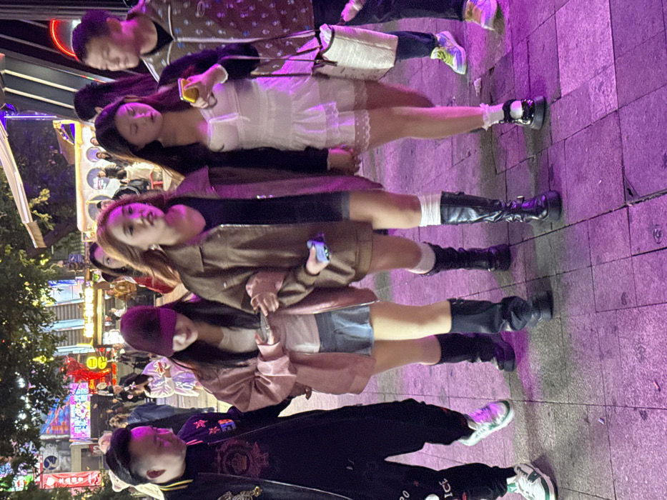 The image captures a nighttime urban street scene in Jiangbei, China, under a dominant artificial illumination that casts a purple hue on the ground and subjects. Five individuals are featured prominently in the foreground, walking from left to right on a paved surface. From the left, an East Asian male with short dark hair, wearing a black jacket with gold embellishments and dark pants, walks with white and green sneakers, looking towards the left. Immediately to his right, an East Asian female with long dark hair, wearing a burgundy baseball cap, a pink oversized jacket, a light-colored top, a light blue denim skirt, and black knee-high boots, holds a smartphone with both hands, looking down. Her left arm is linked with the right arm of the central figure. The central figure is an East Asian female with long, light brown hair, wearing a brown collared jacket, a dark top, dark shorts, white crew socks, and black knee-high boots with buckles. She holds a smartphone in her right hand, looking towards the right side of the frame. She is holding hands with the female to her immediate right. This third female is East Asian, with long dark hair, wearing a black cardigan over a white tiered and ruffled dress, white frilly ankle socks, and black Mary Jane-style shoes with chunky soles. She holds a yellow-cased smartphone in her right hand, looking downwards. To the far right, partially visible, is an East Asian male with short dark hair, wearing a patterned jacket, dark pants, and light green and yellow sneakers. He carries a light-colored woven tote bag on his left shoulder, looking towards the right. The background shows numerous other pedestrians and blurred commercial buildings illuminated by bright, colorful neon signs, some displaying Chinese characters. Trees with lights and what appears to be an escalator are also visible in the mid-background. The ground is paved with rectangular tiles.