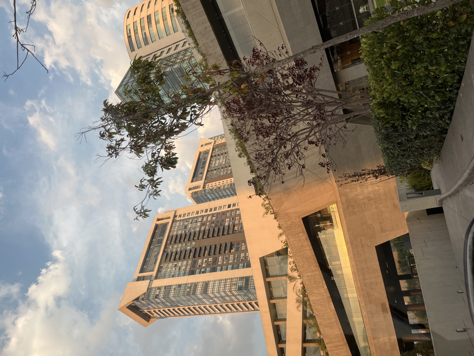 The image displays an urban landscape in Jesús del Monte, Mexico, under a sky with scattered white clouds and soft, warm lighting indicative of sunrise or sunset. The composition is angled upwards, showcasing modern architecture. In the lower-left foreground, a section of a vehicle's dashboard is visible, adjacent to a concrete curb and a dense row of green hedges. A prominent, multi-level building constructed from light-toned concrete or stucco occupies the mid-ground, characterized by sharp geometric angles, terraced levels, and large reflective glass panels. These panels strongly reflect a golden-orange hue. Green foliage and small trees are observed in planters along the building's terraces. A tree with dark reddish-brown leaves stands in the lower-right foreground, partially obscuring the concrete structure. In the background, two tall, contemporary residential towers with glass and light-colored facades are visible, along with a partially obscured curved building to the far right. No individuals, discernible actions, or interactions are present.