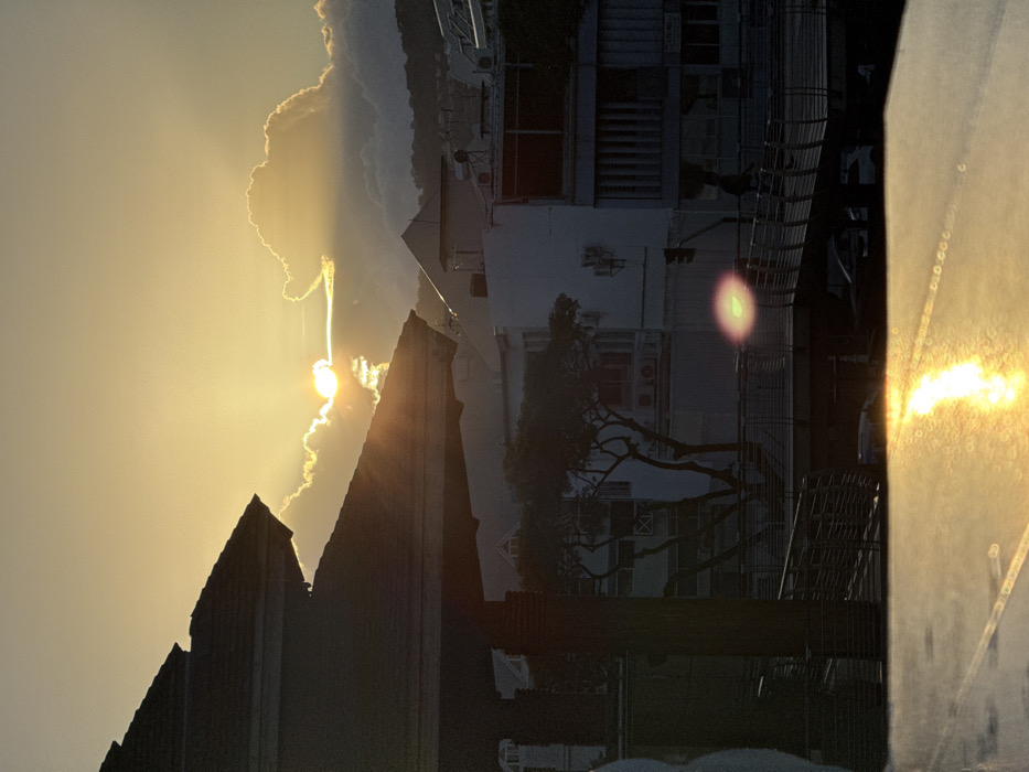 The image depicts a sunset or sunrise over the city of Papeete, French Polynesia (specified as Papeete, France by the prompt). The low sun, partially obscured by clouds, is visible in the upper center, casting a golden light and producing prominent sun rays and lens flare. In the foreground, the dark, multi-tiered roof of a building or gazebo is silhouetted against the bright sky, occupying the upper left quadrant. The lower foreground features a reflective surface, likely wet pavement or a body of water, showing a strong, elongated reflection of the sun. The midground reveals a cityscape. A pedestrian bridge with dark railings crosses horizontally from the lower-mid right. Below the bridge, indistinct vehicles are visible on what appears to be a road or street. Several multi-story buildings, characterized by windows, balconies, and air conditioning units, line the background of the midground. A deciduous tree with bare branches stands silhouetted against these buildings, just to the right of the foreground roof structure. One individual is visible walking on the pedestrian bridge, silhouetted against the illuminated surface. The background consists of rolling hills or mountains under a partly cloudy sky, further away from the city structures. The overall scene is bathed in the warm, intense light of the golden hour, creating strong contrasts between illuminated areas and dark silhouettes.