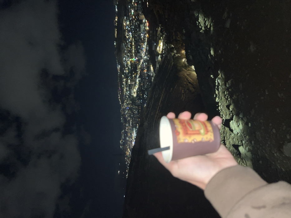A human left hand, clad in a light brown sleeve, occupies the lower-left foreground, holding a brown disposable paper cup. The cup features a white rim, contains a light-colored liquid, and has a dark stirring stick inserted. Decorative graphics are visible on the cup, including a stylized steaming beverage container and text within an ornate frame. The immediate ground surface is dark, rocky, and uneven, with scattered stones illuminated by an unseen light source, casting defined shadows. In the midground and background, an expansive urban landscape is visible at night, characterized by numerous artificial lights illuminating buildings and infrastructure across hills and valleys. The city lights extend towards the horizon. The sky above is dark, with significant cloud cover obscuring most celestial features. The scene is an elevated viewpoint overlooking the city, consistent with a hillside or mountainous area within or adjacent to Dummar Municipality, Syria.