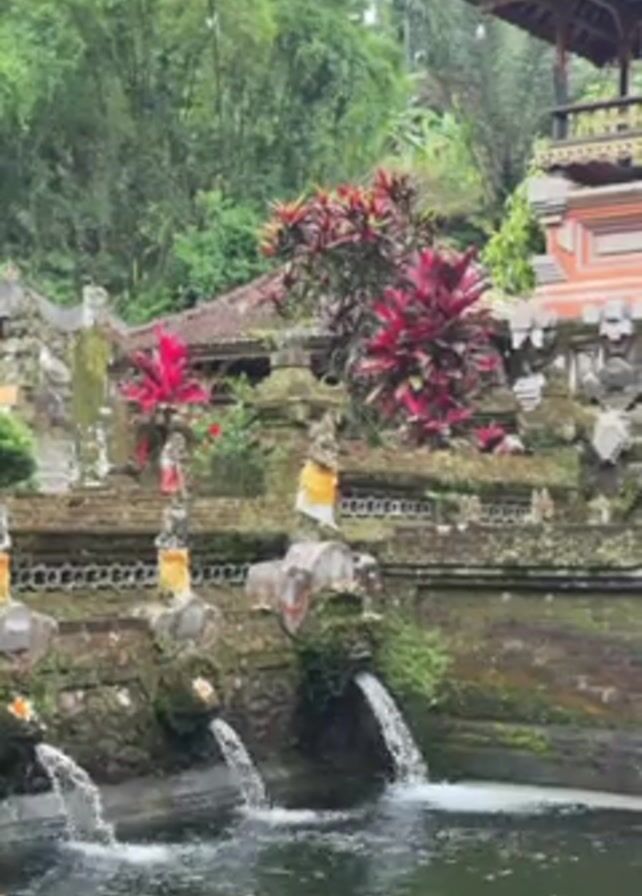Balinese temple complex. Water streams from several dragon-shaped spouts into a pool. The temple structure is stone and brick, with intricate carvings and ornamentation. Lush green vegetation surrounds the temple, including tall bamboo trees and vibrant red plants. The sky appears overcast. The scene conveys a sense of serenity and reverence.