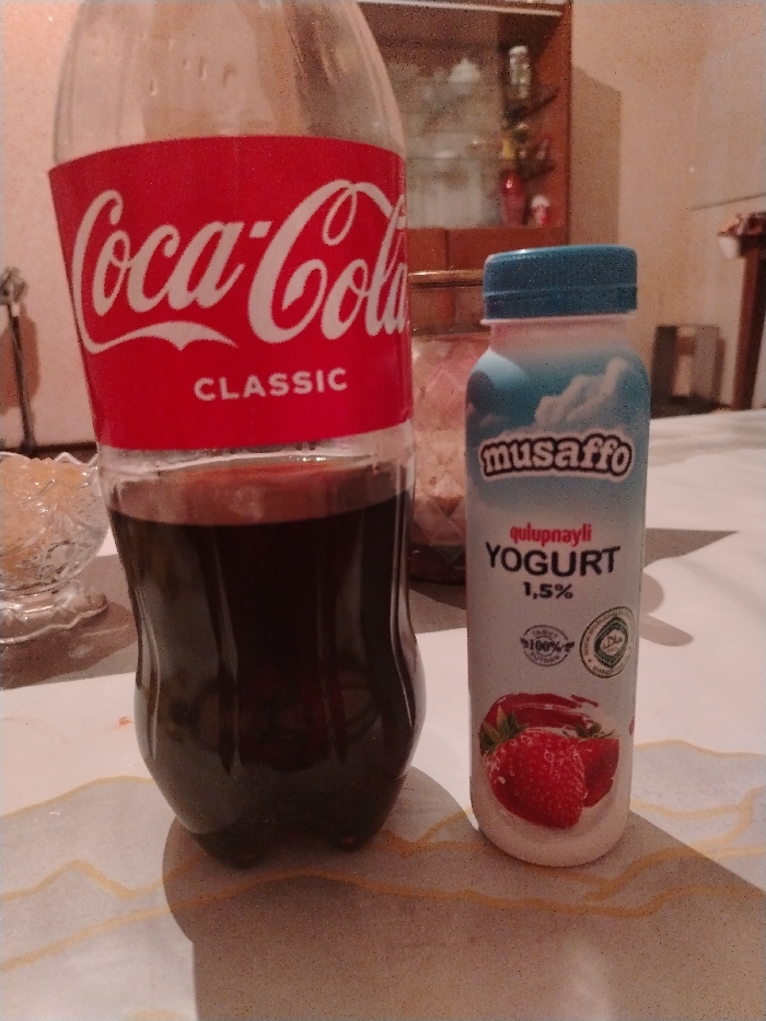 A Coca-Cola Classic bottle, partially filled, stands beside a small bottle of musaffo qulupnayli strawberry yogurt (1.5%). The bottles are positioned on a surface, possibly a table. Background elements include a glass bowl, a cabinet with items inside, and a portion of a table leg, contributing to an indoor setting.