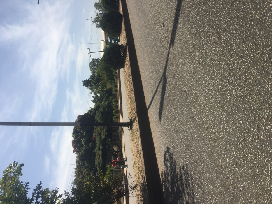 This image captures an outdoor street scene in Jos, Nigeria, under a bright, partly cloudy sky. The foreground and midground are dominated by a paved asphalt road, characterized by a textured surface. A tall, cylindrical grey street light pole stands prominently in the midground on the right, casting a long, distinct shadow diagonally across the road towards the bottom right. To the left of the main road, a secondary paved path or shoulder is visible, separated by a raised curb and a strip of dry, light-brown earth. On this path, a single individual wearing a red shirt is operating a dark-colored motorcycle, moving from left to right. The background features abundant green and reddish-leafed trees and dense foliage, forming a natural barrier. Utility poles with power lines are discernible above the distant tree line. In the right midground, partially obscured by dark green, rounded bushes, a light-colored vehicle, possibly a tricycle, is visible. Shadows from overhead trees are cast onto the asphalt on the left side of the foreground.