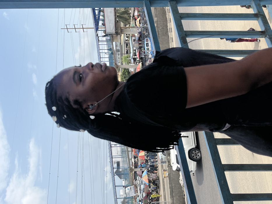 The image depicts an outdoor, daytime urban scene within Lekki, Nigeria, specifically from an elevated pedestrian bridge overlooking a busy section of the Lekki-Epe Expressway, potentially near a market junction such as Jakande. The primary subject is an adult female, viewed from the chest up, positioned in the right foreground behind a blue metal railing. She has dark skin and wears a black short-sleeved top. Her dark hair is styled in braids, some adorned with small white cowrie shells, and gathered into a ponytail. A white wired earphone is inserted into her right ear, with the wire extending downwards. She is oriented to her right, gazing into the distance with a neutral expression. The background details a multi-lane asphalt road with active vehicular traffic, including a white SUV and a blue and white passenger van. To the left of the road, a bustling street market operates, characterized by numerous stalls, many covered with diverse colored umbrellas, and populated by multiple individuals. Beyond the immediate market, another elevated pedestrian bridge or walkway is visible, featuring a blue-colored roof structure, with figures traversing it. Overhead, multiple power lines stretch across the frame, supported by distant utility poles. The sky above is light blue with scattered white clouds.