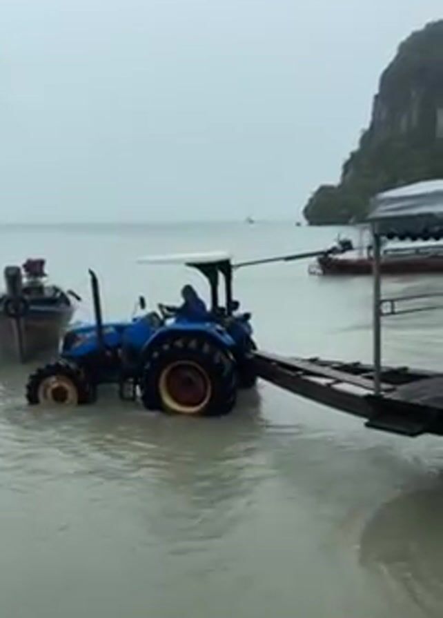 blue and yellow tractor with a canopy on a beach, partially submerged in the water. The tractor is pulling a flatbed trailer towards a small pier. A woman in a yellow and blue shirt walks onto the trailer. There are boats visible in the background on the water and a large rock island in the distance. The weather appears overcast.