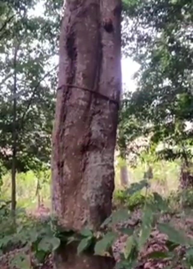 brown tree in a forest. A dark brown vine is wrapped around the trunk of the tree. The camera looks up at the tree as it pans up the trunk and to the branches above. The background consists of other trees and green plants. The sky is visible through the branches.
