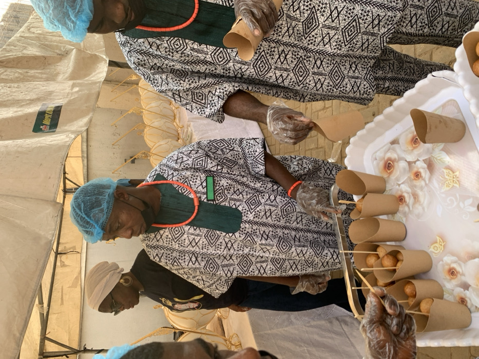 Two individuals are preparing what appears to be a fried dough snack. One person wears a blue hairnet and a patterned shirt with green and orange accents, using a skewer to place the fried dough balls into small paper cones. The other person, also in a similar patterned shirt, is filling empty cones. The snacks are arranged on a white tray adorned with a floral pattern. Both individuals are wearing clear plastic gloves, suggesting a hygienic food preparation process.