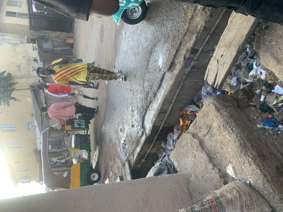 The image depicts a street scene in a dense urban area, identified as Jos, Nigeria, under daylight conditions with prominent sunlight. The foreground features an open concrete drainage ditch, approximately 50cm wide, running parallel to the roadway, filled with an accumulation of plastic bottles, bags, and general refuse. A wooden plank bridges a section of this ditch. To the immediate left of the ditch, a white sack containing granular material is partially visible. The main roadway, appearing wet and uneven, is occupied by several individuals and vehicles. A prominent yellow and green Keke NAPEP (tricycle taxi) with the registration number "PTA 628" is positioned on the left side of the road; a driver is visible inside, and a male subject in a light red/pink shirt and dark trousers stands beside its rear. Adjacent to the Keke NAPEP, another male subject in a red and white shirt and dark shorts stands, holding a small white object. In the mid-ground, a young male subject with short dark hair, wearing a yellow t-shirt with red diagonal stripes, camouflage-patterned trousers, and light-colored sandals, walks towards the camera. He holds a dark mobile phone to his right ear, seemingly engaged in a conversation. On the far right, the front wheel and partial body of a light blue/green scooter are visible. The background consists of light-colored, multi-story buildings, some appearing residential, under a bright sky. The overall environment suggests a bustling area with visible signs of infrastructure wear and waste accumulation.