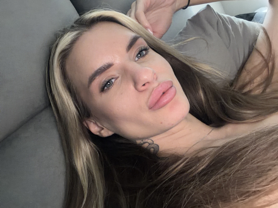 A close-up selfie depicts a female individual with long blonde and brown hair, blue eyes, dark eyebrows, and full, light pink lips, slightly puckered, looking directly into the camera