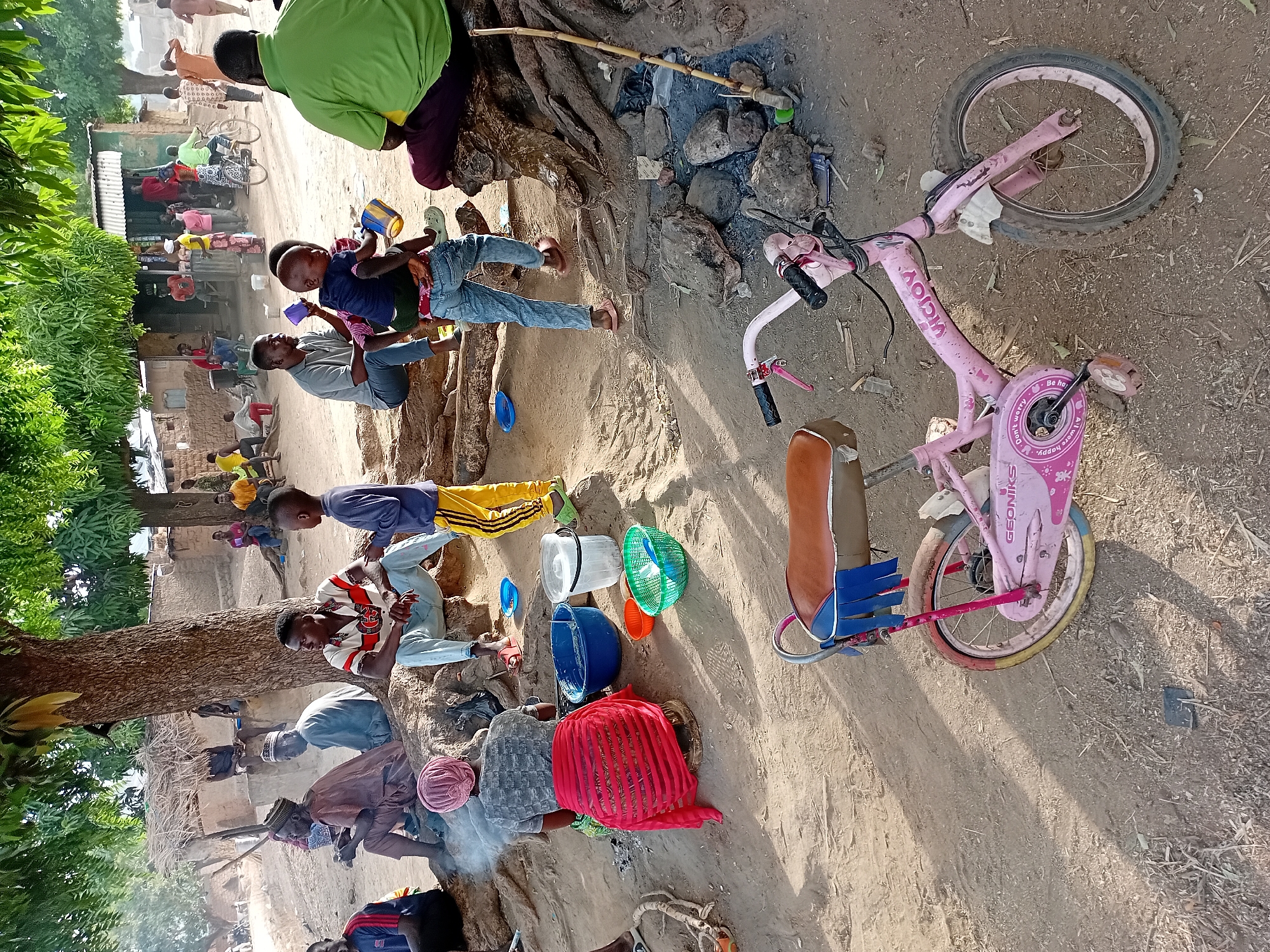 This image depicts an outdoor communal area in Nata-Ala, Nigeria. The scene is characterized by dirt ground, strong daylight casting shadows, and a large tree with prominent exposed roots dominating the central foreground. In the foreground, a pink child's bicycle, branded "VICJOY" and "GEONIKS," rests on the ground. To the left, a woman wearing a grey top and a red wrap is seated on a low stool, tending to a small, smoldering fire contained by rocks. Adjacent to her are a blue plastic basin, a white plastic bucket, an orange bowl, and a green woven basket. Multiple individuals are seated on the tree roots. From left to right: an older man in a brown robe and cap; another older man in a light blue robe and cap; a man in a red, white, and black striped polo shirt and light blue jeans, interacting with a young boy in a blue shirt and yellow track pants; a man in a grey t-shirt holding a young child in a blue top and jeans on his lap, both holding cups; and a man in a lime green t-shirt seated with his back partially to the camera. In the mid-ground and background, additional people are present near single-story structures, some with thatched roofs and others with corrugated metal roofs. One individual is visible riding a bicycle past these buildings. The overall scene portrays a casual gathering with various daily activities underway.