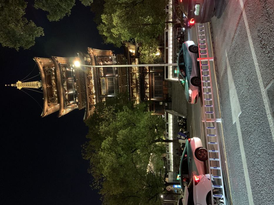 The image captures a nighttime urban scene in Shangcheng District, China, featuring the brightly illuminated multi-tiered Chenghuangge (City God Pavilion) as the central subject
