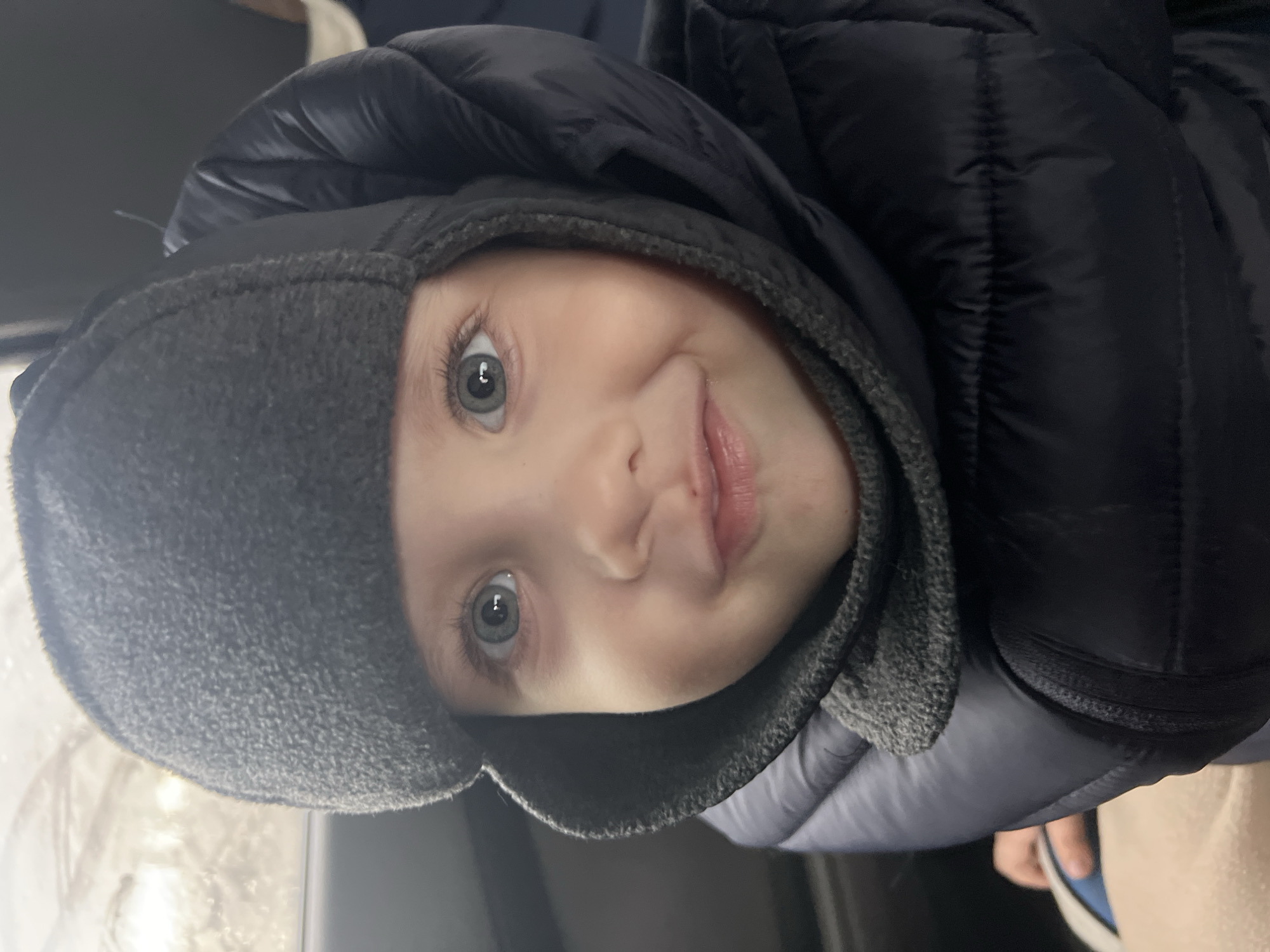 A young child with light skin, light blue eyes, and pink lips is looking directly at the camera with a slight smile. The child is wearing a dark grey hooded hat and a dark blue puffer jacket. The background appears to be an interior setting, possibly inside a vehicle. There is a window to the left with blurred white shapes outside. The location is Chaikovsky, Russia.