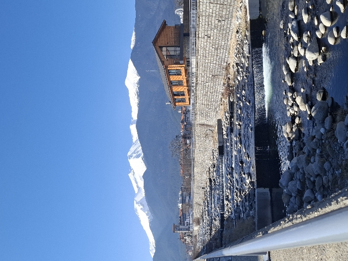 This image presents a panoramic view of the Glazne River in Bansko, Bulgaria, under a clear blue sky. In the far background, the snow-capped peaks of the Pirin Mountains rise majestically, their lower slopes covered in dark evergreen forests. The Glazne River occupies the foreground and mid-ground, characterized by a series of artificial weirs forming cascading steps that create small waterfalls. The riverbed is densely covered with numerous grey and white rocks of varying sizes. Water flows visibly over these weirs, with agitated white water at the base of each drop. On the right bank, a substantial stone-faced retaining wall with a flat, paved top runs parallel to the river. Behind this wall, a prominent two-story building with orange-brown wooden siding and a dark grey pitched roof is visible. This modern structure features large windows on its river-facing facade and a white-railed balcony on the upper level. To the left of this wooden building, further into the town, other urban structures with lighter-colored facades and a distant tower (possibly a church steeple) are discernible. In the immediate left foreground, a grey concrete walkway with a silver metal railing extends along the river, indicating the vantage point. The scene is devoid of people, active interactions, or discernible movement beyond the flowing water. The overall environment suggests a clear, bright day, likely in a cooler season given the snow on the mountains.