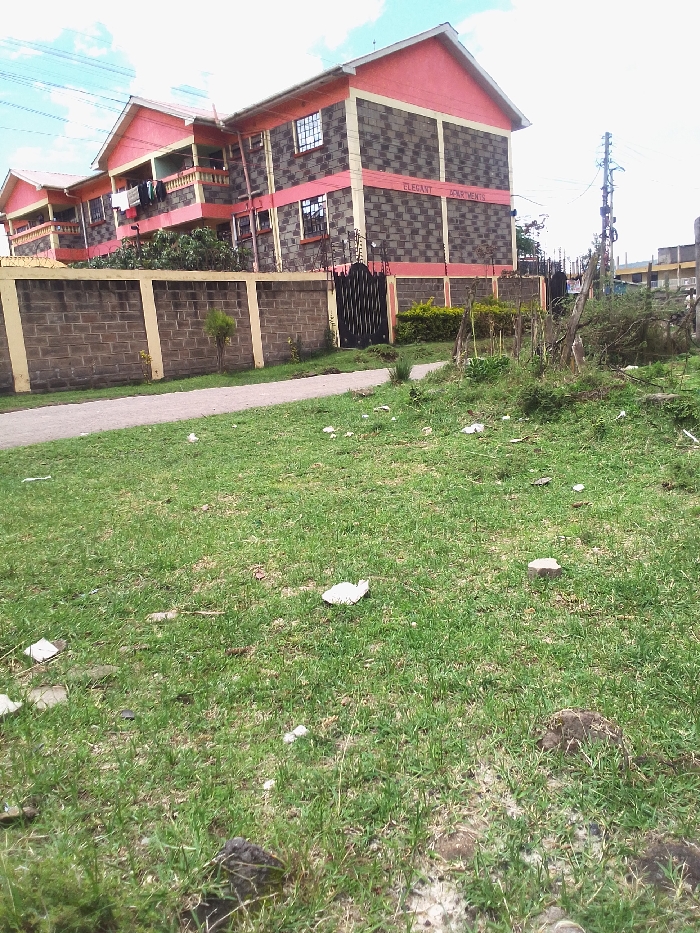 The image depicts an exterior view of "Elegant Apartments" in Nakuru, Kenya, under an overcast sky