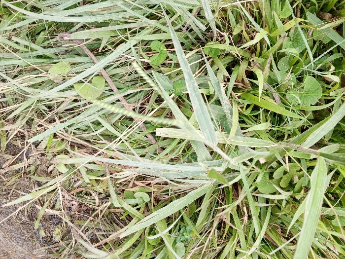 A close-up, top-down forensic image captures a dense patch of ground vegetation in Thotagamuwa, Sri Lanka. The scene is primarily composed of various herbaceous plants, featuring abundant long, narrow blades of grass ranging from light to dark green. Interspersed among the grass are several broad-leafed plants, some exhibiting rounded or heart-shaped green foliage. A distinct green flowering or seed stalk, characterized by small, textured protuberances, diagonally crosses the frame from the lower right to the upper-center-left. Scattered throughout the ground cover are dried, light brown grass blades and small organic debris. Patches of dark, damp earth are visible beneath the vegetation, notably towards the lower left quadrant. No individuals, animals, man-made objects, actions, or interactions are depicted within this natural environment.