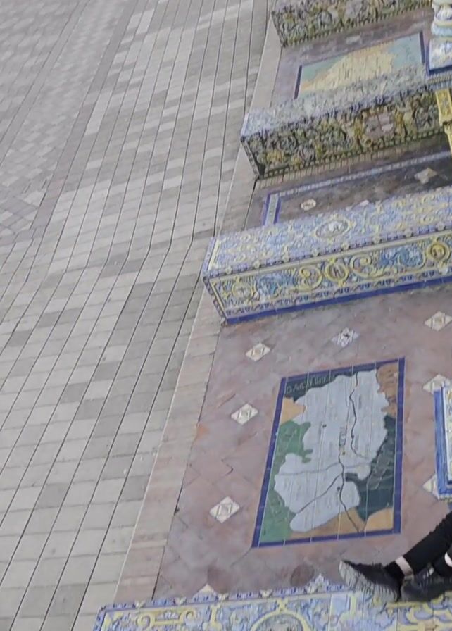 - "high-angle view looking down onto a plaza with decorative tiled benches" by FM-eQMAb2, licensed under CC BY 4.0