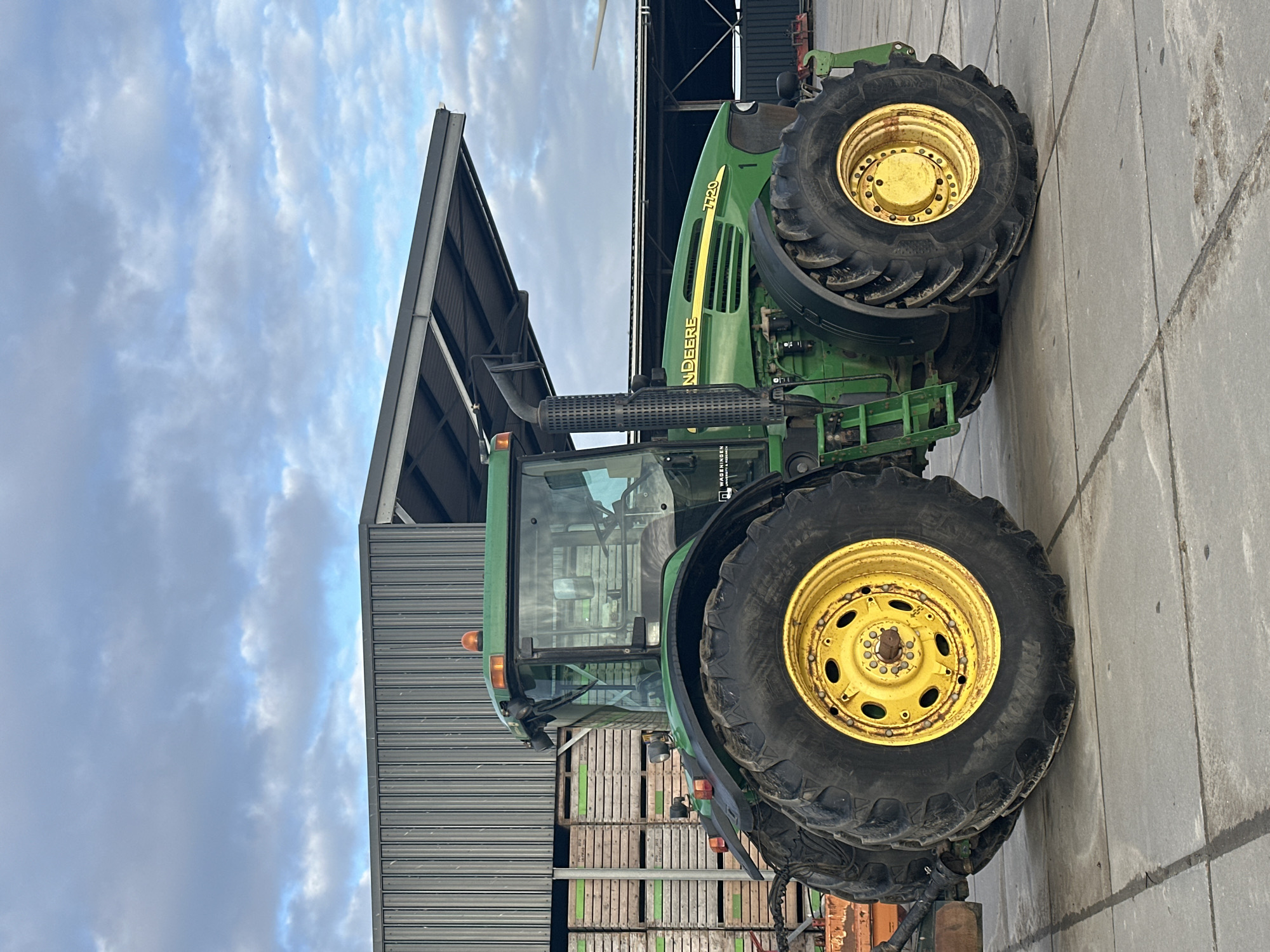 A green John Deere tractor, specifically a 7730 model, is parked on a concrete surface next to a building with corrugated metal siding in Lelystad, Netherlands