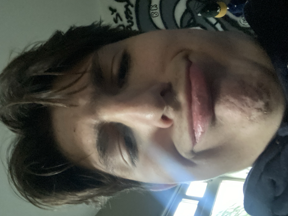 A face is centered, gazing downward. The person's eyes are partially closed, and their tongue protrudes slightly. The skin shows some blemishes and texture. Dark hair is visible around the face, and a small portion of what appears to be a patterned blanket or tapestry sits in the background. Lower in the frame, a hint of a window is detectable. The image appears to be taken from a low angle, looking up at the subject.