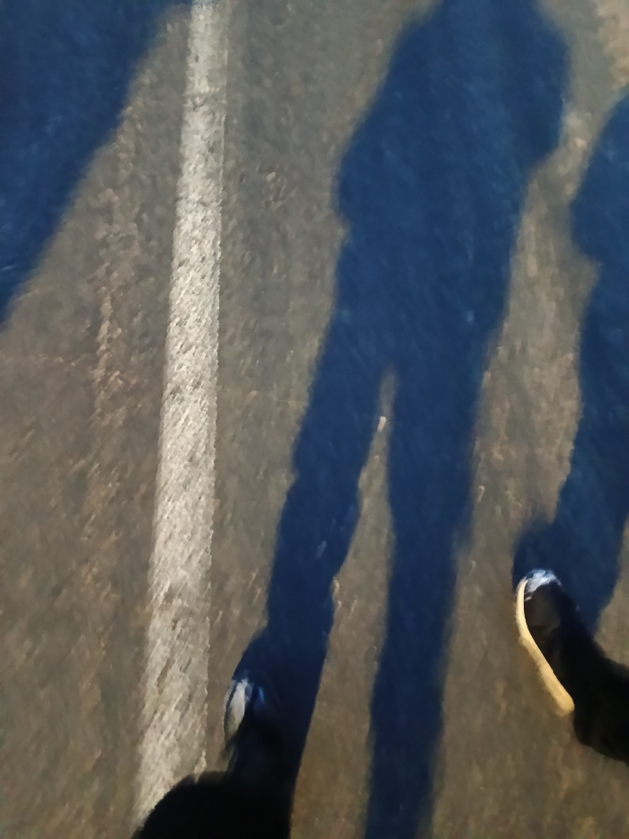 The image displays an overhead perspective of a paved, dark grey surface in Красный Маяк, Russia. A single, prominent white line extends vertically through the center of the frame, marking the surface. Multiple elongated, dark blue shadows, consistent with human figures, are cast across the grey pavement. At least three distinct shadows are discernible. In the lower portion of the image, two human feet wearing dark shoes are visible. The left foot is largely obscured by a shadow, while the right foot, with a light-colored sole or toe cap, is clearly seen. The presence of long shadows indicates a strong, directional light source.