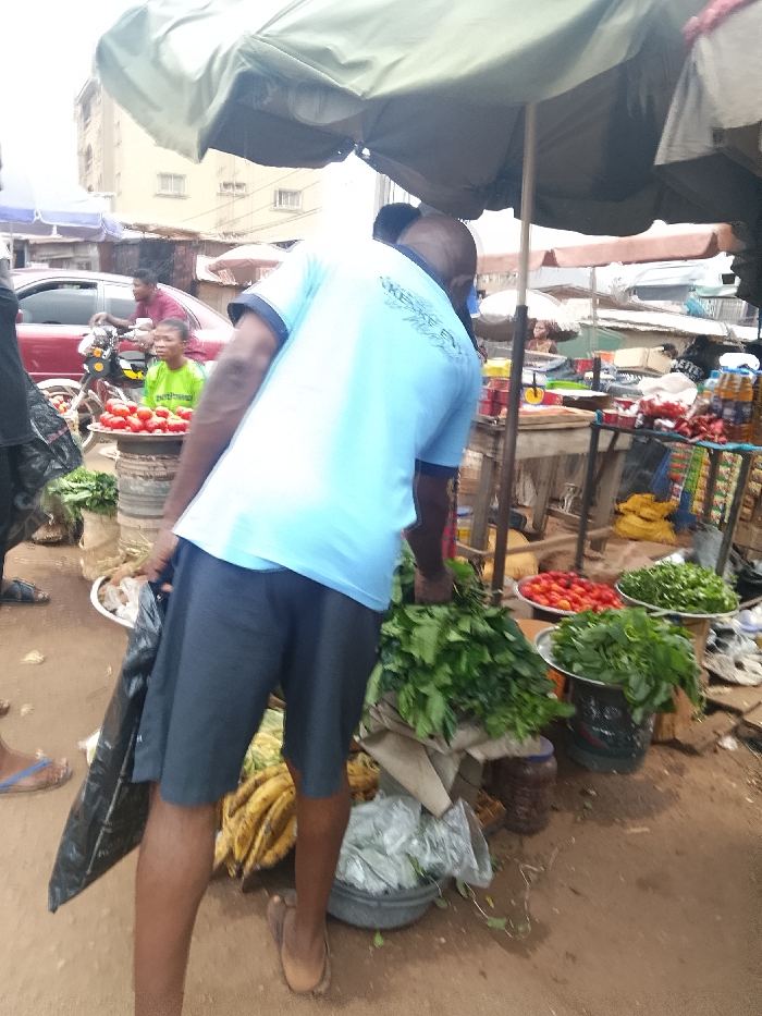 The image presents an active outdoor market scene in Nsugbe, Nigeria. In the immediate foreground, a person viewed from the rear, wearing a light blue short-sleeved shirt with a partial "KEKE ENN" logo on the back and dark grey shorts, holds a large bundle of green leafy vegetables in their right hand and a black plastic bag in their left. They are wearing light brown flip-flops. To the left of their legs, a grey basin containing light-colored items rests on the reddish-brown dirt ground. To the right, a pile of yellow bananas is visible on a low surface. The midground features multiple market stalls operating under a large, olive-green umbrella supported by a central pole. On the left, a metal basin filled with red tomatoes is displayed, with a person in a bright green shirt visible behind it. Further back, a red sedan is parked, and a person on a motorcycle is situated near it. Various market goods are arranged on wooden tables and low stands. These include additional displays of red tomatoes and several types of green leafy vegetables in white and dark basins. Bottles of cooking oil, packaged goods, and a small weighing scale are also present on the stalls. The background reveals a multi-story building with small windows on the left and more rudimentary market structures with diverse roofing materials extending towards the right. The sky overhead appears overcast. The ground throughout the visible market area consists of reddish-brown dirt. Multiple individuals are present within the scene, engaging in market-related activities.